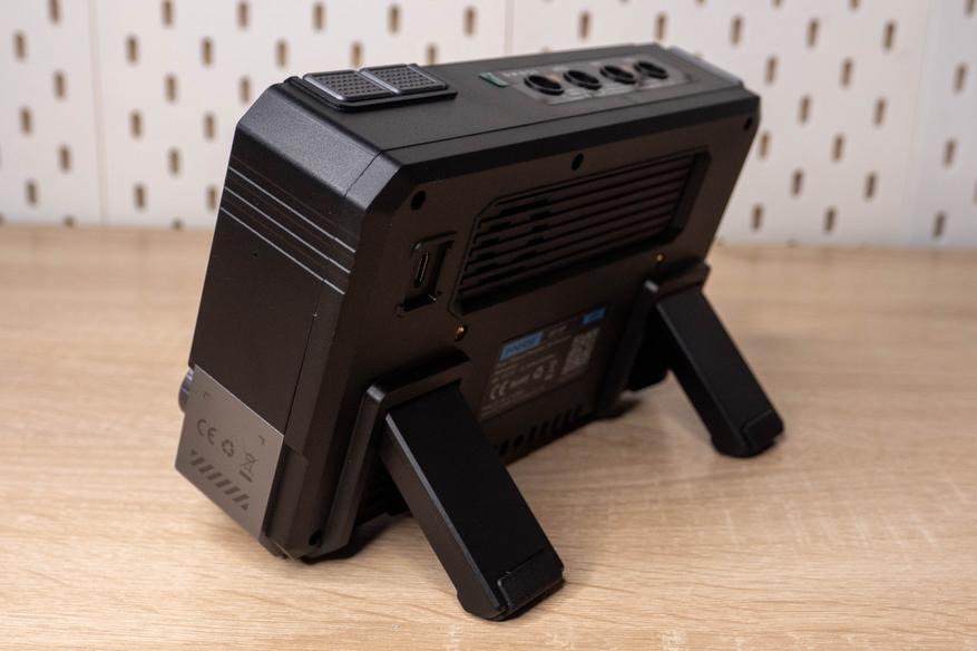 В нижней части корпуса имеются откидные ножки с противоскользящие подошвами, у которых скосы имеются под двумя углами для устойчивого размещения как вертикально, так и под наклоном.