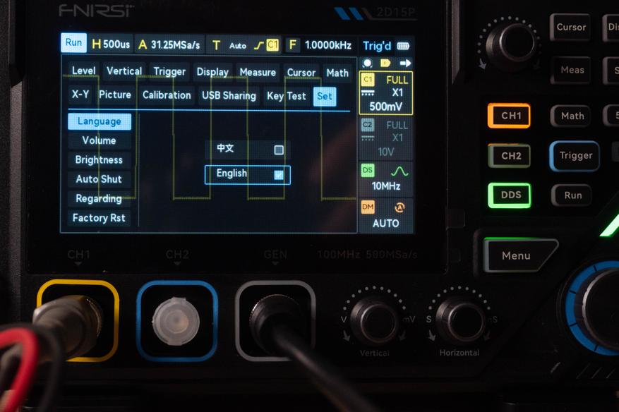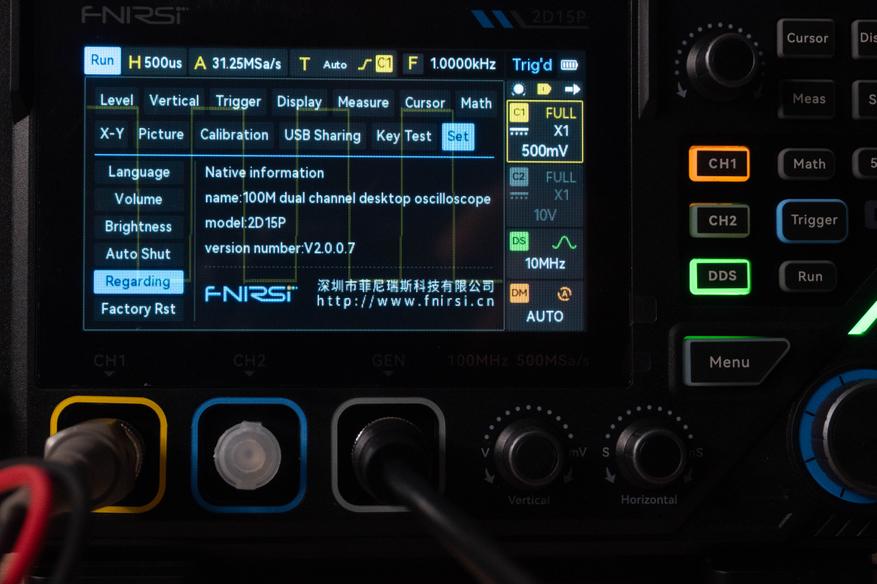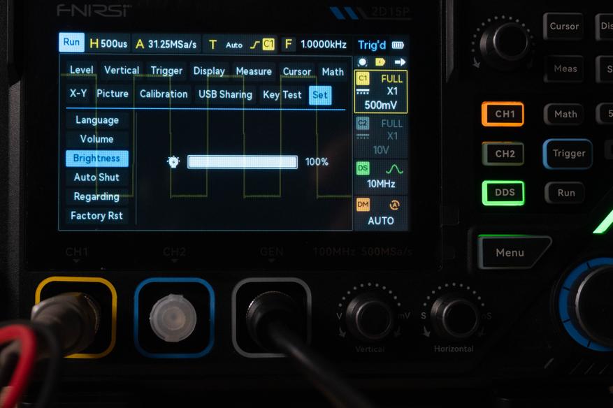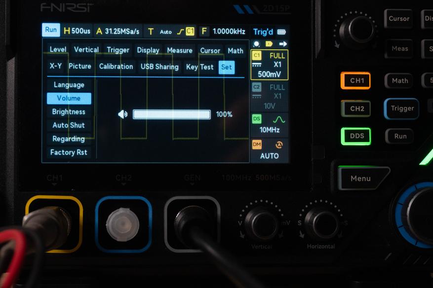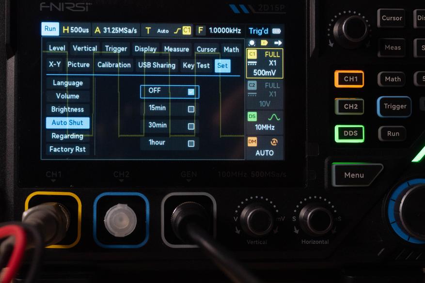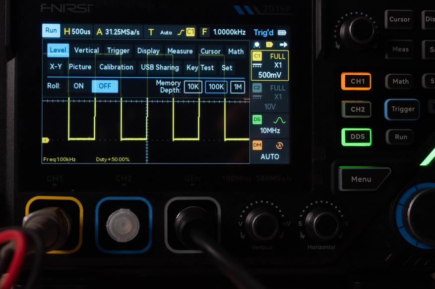Энкодер «Horizontal» управляет горизонтальной разверткой от 50 с до 5 нс, при этом если активен второй канал, выборка варьируется от 312 Sa/s до 250MSa/s, а если не активен, то значение увеличивается до 500 MSa/s.