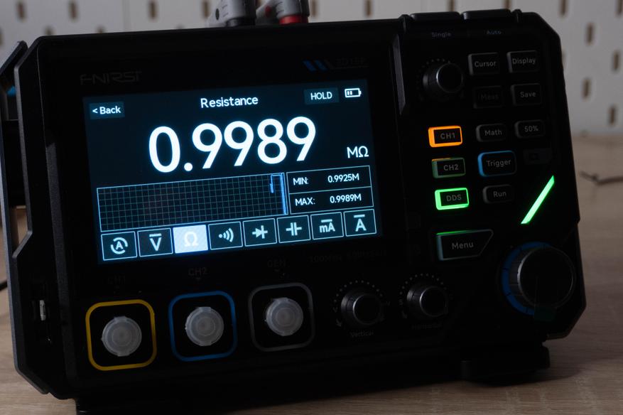 Новая модель сочетает в себе как сенсорное, так и привычное управление с помощью физических кнопок и энкодеров, что сильно упрощает подстройку параметров. Он обеспечивает частоту дискретизации 500 Мвыб/с, полосу пропускания 100 МГц для одного канала (50 МГц в двухканальном режиме) и глубину памяти 10К-1М. Генератор сигналов выдает до 10МГц, мультиметр True RMS на 19999 отсчётов поддерживает все стандартные измерения с выводом дополнительной информации на дисплей.