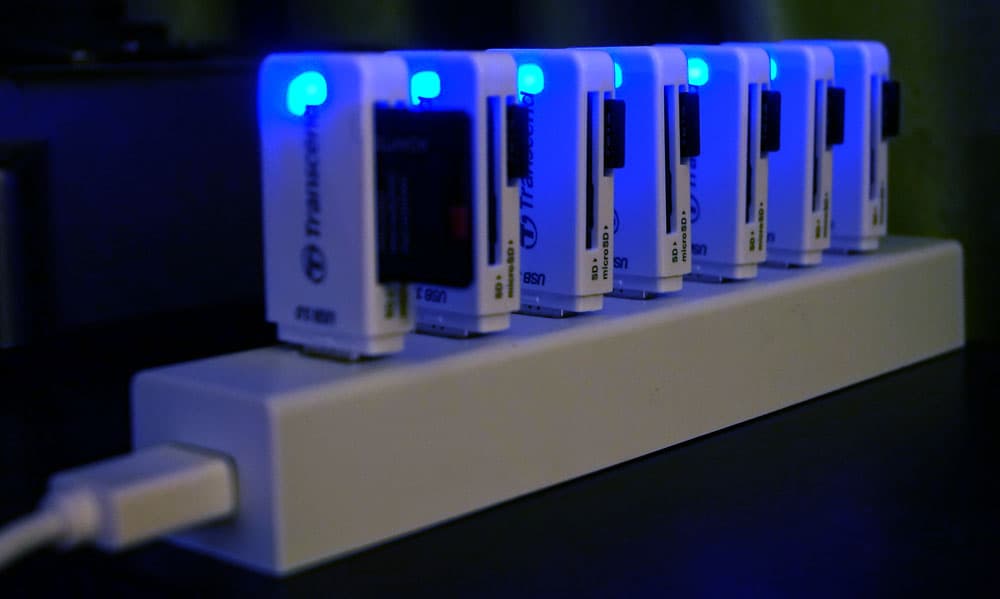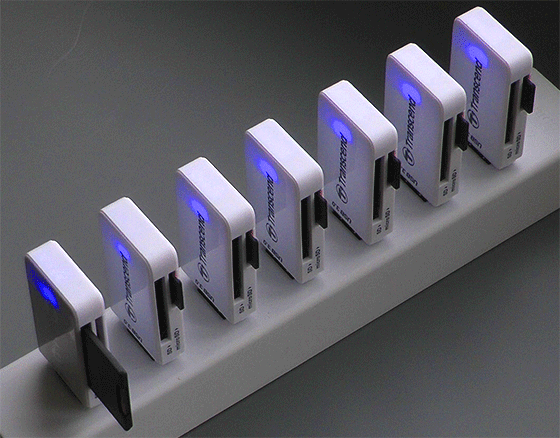 На самом деле такой способ импорта оказывается быстрее, чем процесс установления связи с камерой по локальной сети с последующим долгим копированием десятков, а возможно, и сотен гигабайт информации через неспешный сетевой контроллер. Гораздо проще вынуть семь карт памяти из слотов камеры и вставить их в скоростные картоводы, а те, в свою очередь, в хаб.
