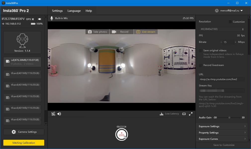 Этот адрес следует ввести в адресную строку соединения в управляющей программе Insta360Prо, и картинка с камеры отобразится в окне просмотра.