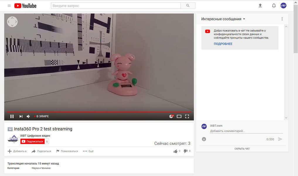 Во время трансляции зрители могут изменять направление взгляда мышкой, точно так, как это делается при просмотре обычных, заранее «залитых» на YouTube, панорамных видеороликов. Вместе с видеопотоком поступает и звук, а задержка сигнала в нашем случае составила около 20 секунд.
