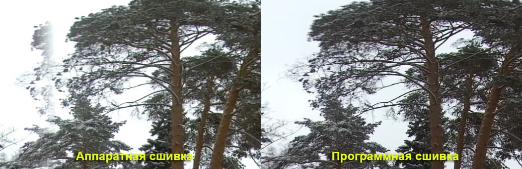 Попробуем сравнить качество аппаратной склейки камерой с качеством программной обработки. Для этого возьмем стоп-кадр из панорамного ролика, «сшитого» камерой, и сравним со стоп-кадром, который взят из результата программной (по идее — более аккуратной) сшивки.
