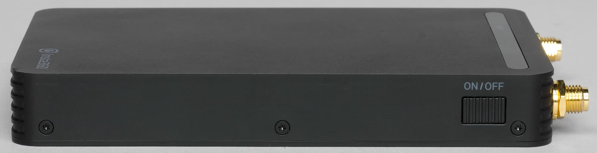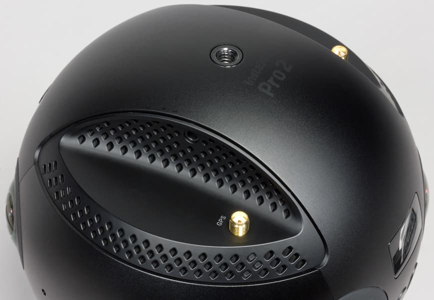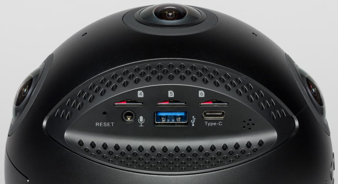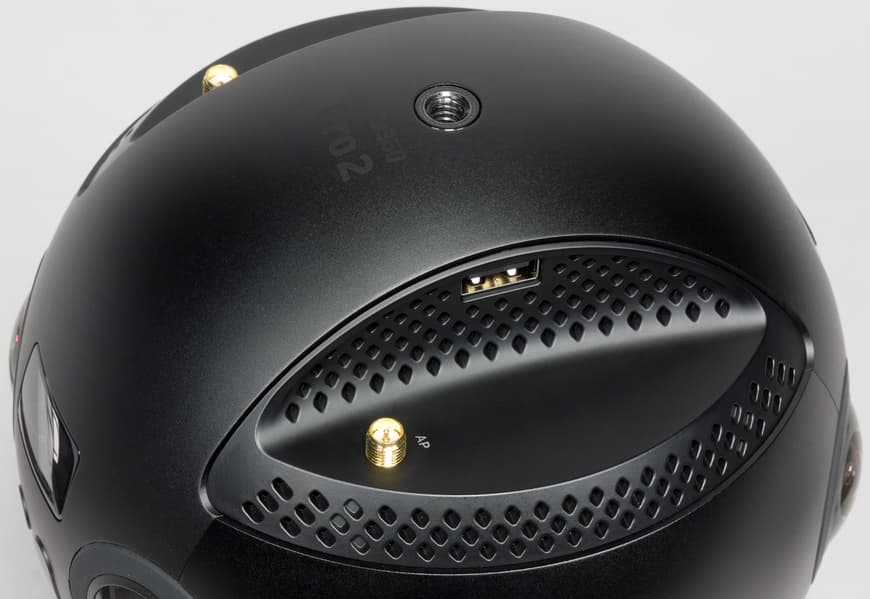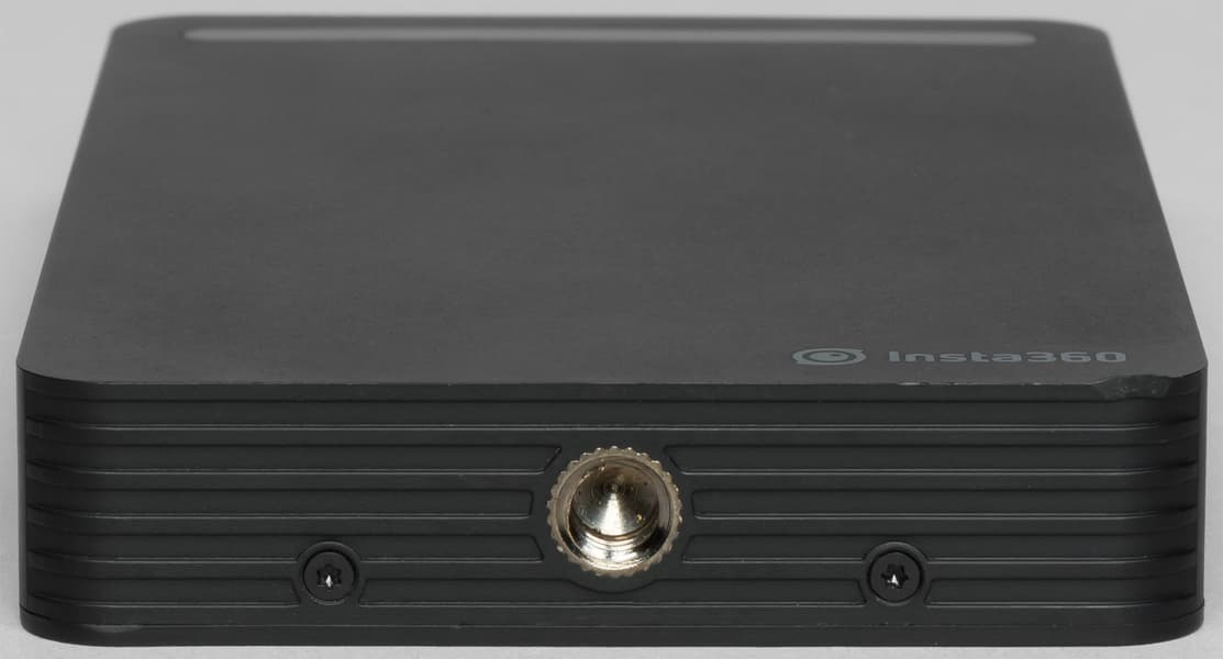 В верхней части корпуса, на «северном полюсе», появилось резьбовое отверстие стандартного диаметра 1/4″. Оно предназначено для крепления передатчика Insta360 FarSight и/или микрофонной системы. Одна из верхних боковых граней обогатилась портом USB 2.0, который нужен для подключения внешнего аудиорекордера либо питания внешних устройств (например, FarSight). Противоположная верхняя грань также имеет дополнительный микрофонный вход 3,5 мм.