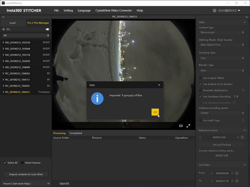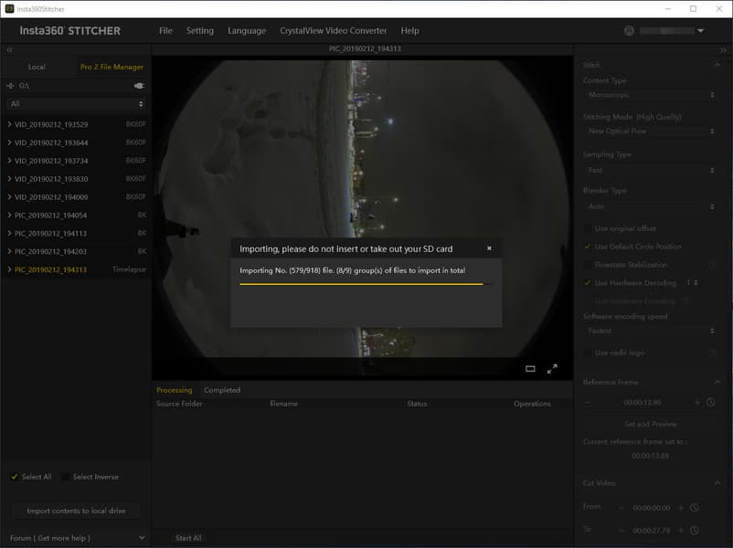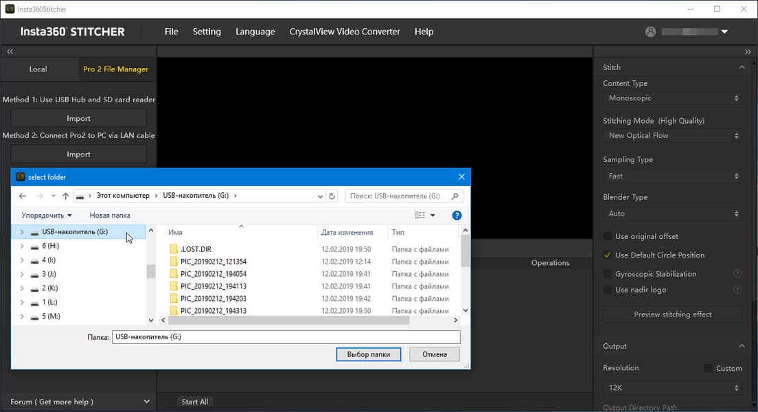 В обоих случаях, что при импорте через USB-картоводы, что при соединении по LAN, для импорта видео и фото используется особый модуль копирования материала, находящийся в одной из вкладок программы Insta360 Stitcher: Pro 2 File Manager. Этому модулю требуется указать расположение корневой, главной карты памяти, на которой записана структура снятых камерой панорамных материалов.