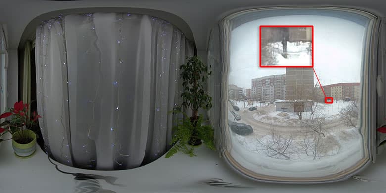 А вот здесь уже при очень внимательном изучении можно заметить пусть и мелкие, но все же несостыковки: мутноватые размытые участки в промежутках между объективами и двоение некоторых объектов.