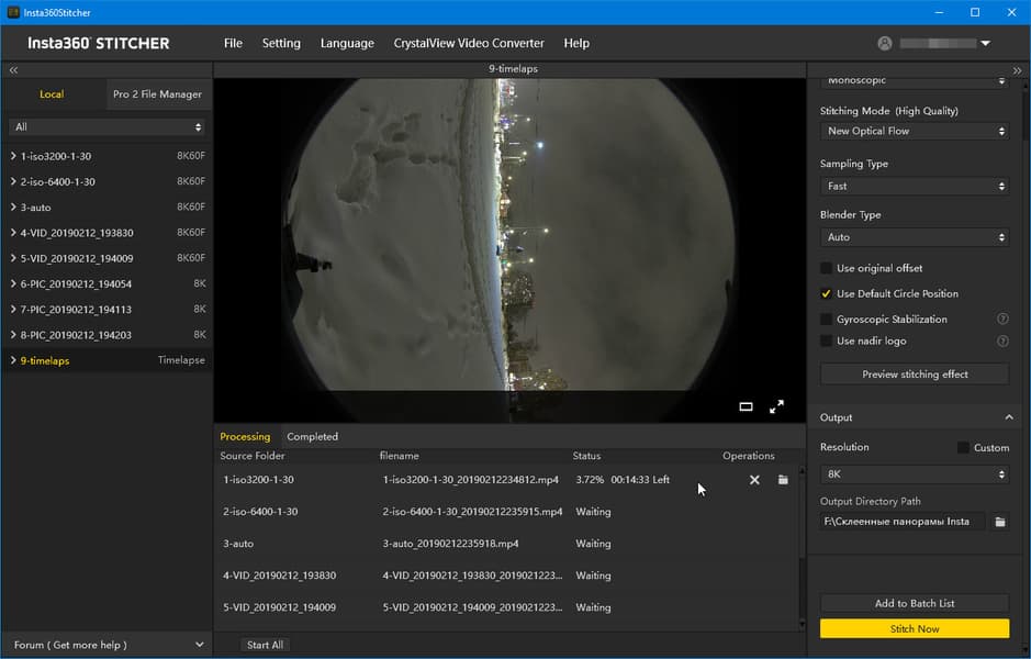 Помимо локального просмотра на ПК, разработчик предоставил возможность просмотра роликов с разрешением до 8К на мобильных устройствах. Для этого используется фирменное приложение Insta360 Moment. Но есть один минус: для того, чтобы данное приложение «увидело» панорамный ролик, его необходимо перекодировать в специальный формат с расширением .VRB. Это делается непосредственно в программе Insta360 Stitcher. Здесь, в модуле CrystalView Video Converter, необходимо выбрать платформу, на которой будет воспроизводиться видео, после чего запустить кодирование заранее «сшитого» панорамного ролика.