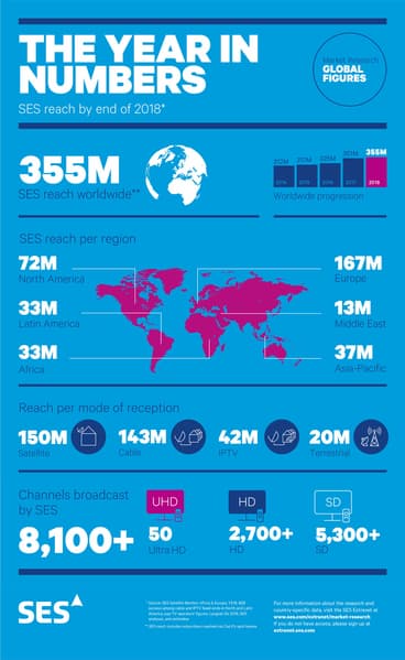 Больше всего пользователей SES — 167 миллионов — в Европе. В Европе спутниковое вещание, и особенно технология Direct-to-Home (DTH), остается ведущей технологией распространения видео. В Северной Америке SES поставляет контент 72 млн домохозяйств, в Азиатско-Тихоокеанском регионе — 37 млн, в Латинской Америке — 33 млн, в Африке — 33 млн, на Ближнем Востоке — 13 млн. SES предоставляет абонентам почти 2800 каналов HD и более 40 коммерческих каналов UHD — больше, чем любой другой поставщик спутниковых услуг.