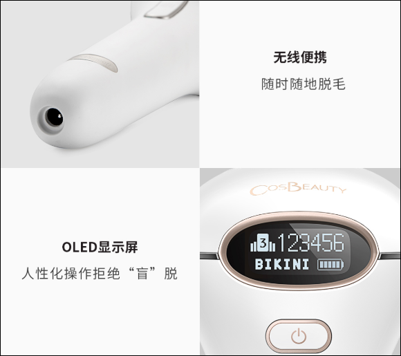 Прибор комплектуется тремя насадками разного размера для разных участков тела — для обширных участков, таких как ноги и руки, для лица и для зоны бикини. Экран OLED показывает режим работы и уровень заряда аккумулятора.