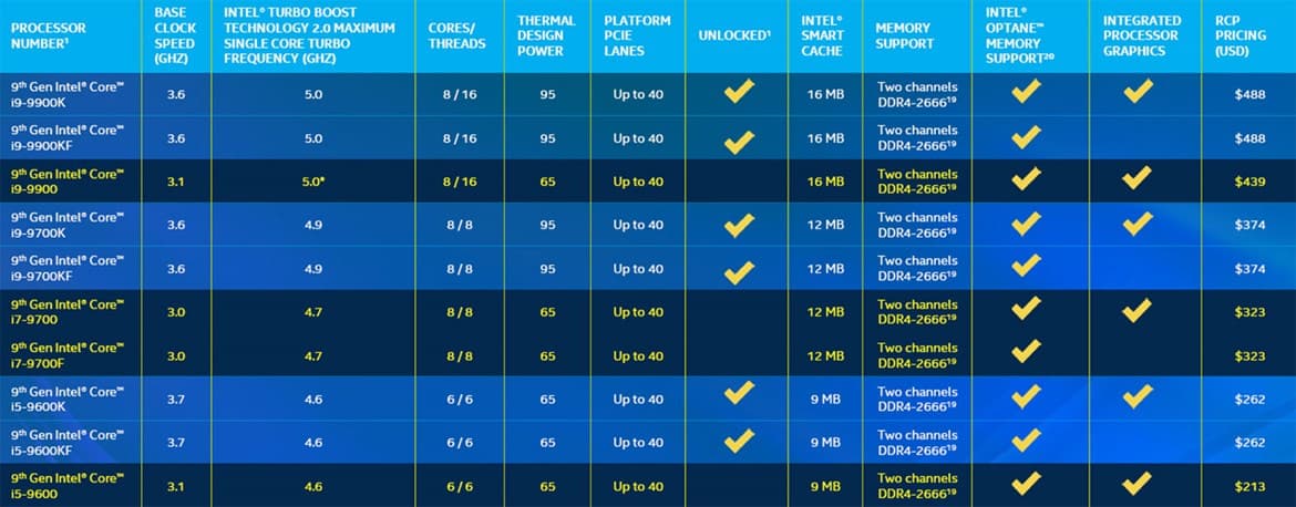 Вместе с шестью мобильными процессорами для высокопроизводительных ноутбуков Intel представила 25 моделей CPU для настольных ПК. Все они относятся к девятому поколению процессоров Core (семейство Coffee Lake Refresh), но фундаментально базируются на архитектуре Skylake шестого поколения Core из 2016 года. Все процессоры выпускаются по техпроцессу 14 нм и имеют до 8 вычислительных ядер. Различия обусловлены наличием или отсутствием встроенной графики (во втором случае в названии присутствует буква F), блокированным или разблокированным (буква К) множителем, нормальной или пониженной (буква T) частотой и, соответственно, TDP.