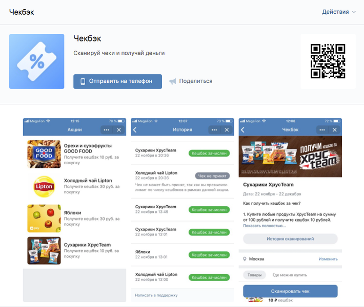 Для возврата денег потребуется выбрать нужную акцию в сервисе VK Pay и отсканировать QR-код на чеке через специальное приложение «Чекбэк». Если один чек подходит под условия нескольких акций, его нужно использовать для каждой акции в отдельности. Сумма кешбэка стартует от 10 рублей и зависит от конкретной акции.