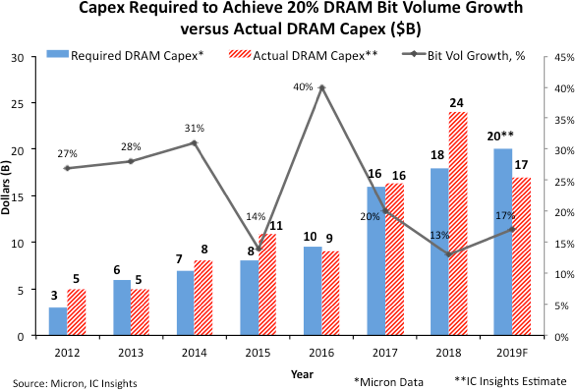 После огромных капиталовложений в DRAM в 2017 и 2018 годах отрасль перешла к их сокращению, вызванному снижением цен. При этом все основные поставщики DRAM — Samsung, SK Hynix и Micron — согласны, что в терминах информационного объема в ближайшие годы выпуск будет расти примерно на 20%.