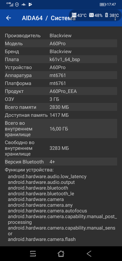 В смартфоне установлен процессор Helio A22 с частотой 2ГГц, а в помощь ему отправили 3Гб оперативной и 16Гб встроенной памяти, которая после первого включения и обновления установленных приложений доступна в размере около 7.5Гб. Благо можно установить карту памяти и решить проблему нехватки места. В повседневных задачах смартфона хватает для серфинга интернета, нетребовательных игр и просмотра видео. В Antutu Blackview A60 Pro набирает 61000 балов, что является обычным результатом для недорогих смартфонов. Датчики освещенности и приближения были проверены вручную и они срабатывают нормально. Тачскрин экрана рассчитан только на 3 касания.