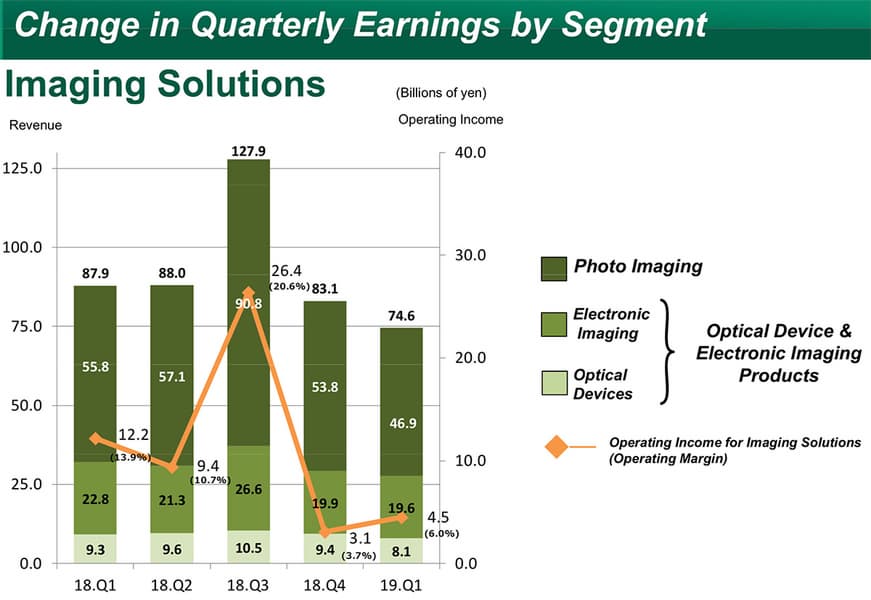 В сегменте, не включающем цифровые камеры, выручка снизилась из-за таких факторов, как уменьшение продаж фотобумаги, спад спроса перед выпуском новых продуктов и корректировка складских запасов некоторыми розничными продавцами, продающими в США системы Fujifilm для моментальной фотографии.