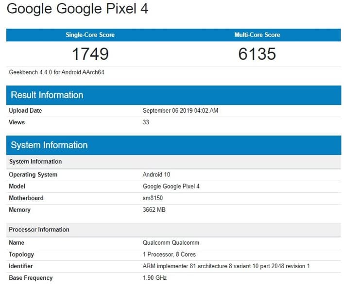 В базе Geekbench есть апрельский результат Pixel 4 XL, где объём ОЗУ составляет 4 ГБ, а есть сегодняшний результат Pixel 4, где ПО также определило лишь 4 ГБ оперативной памяти.