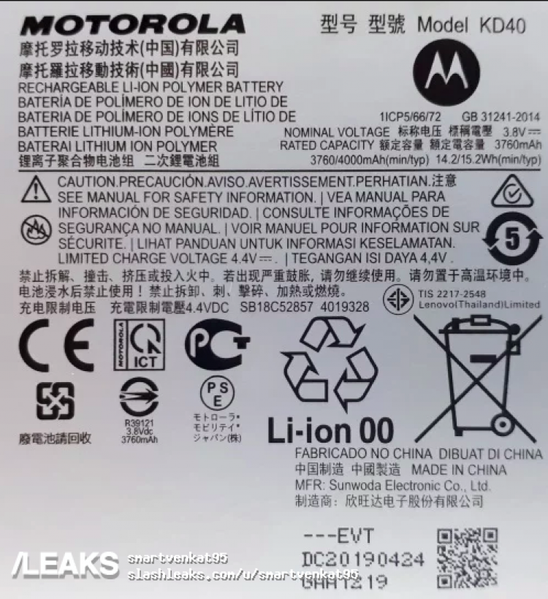 Фотография подтверждает, что Moto XT2019-2 будет оснащен литий-ионным аккумулятором, емкость которого составит 4000 мА•ч.