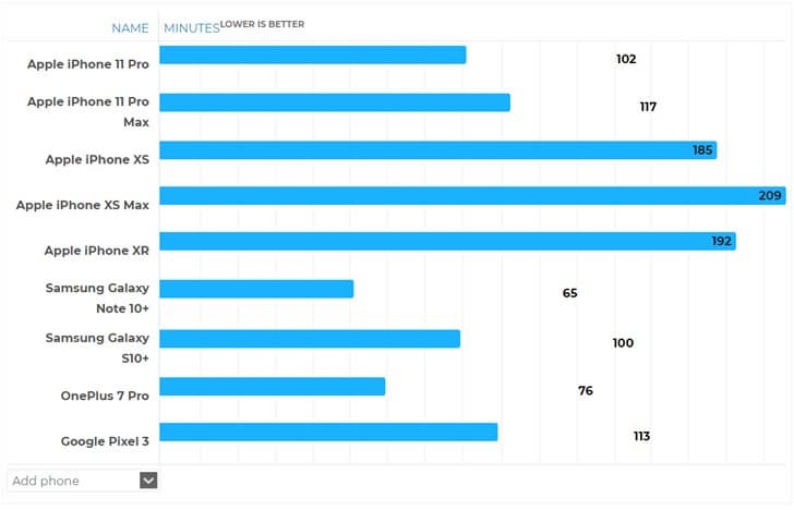 - Полный заряд — 1 час и 43 минуты у iPhone 11 Pro и 1 час и 57 минут у iPhone 11 Pro Max