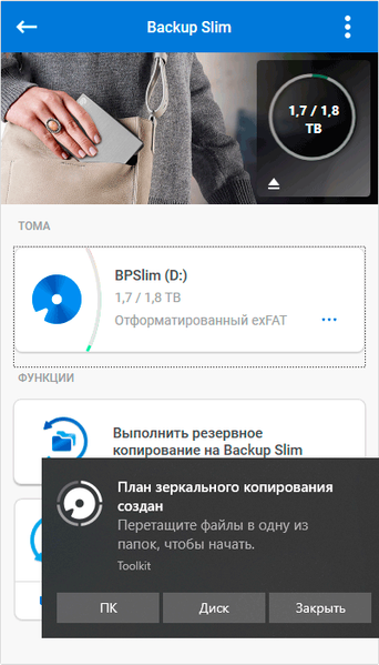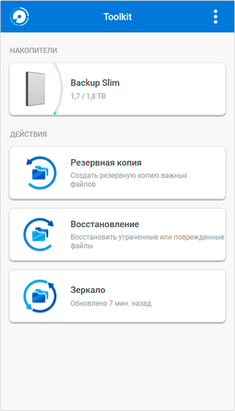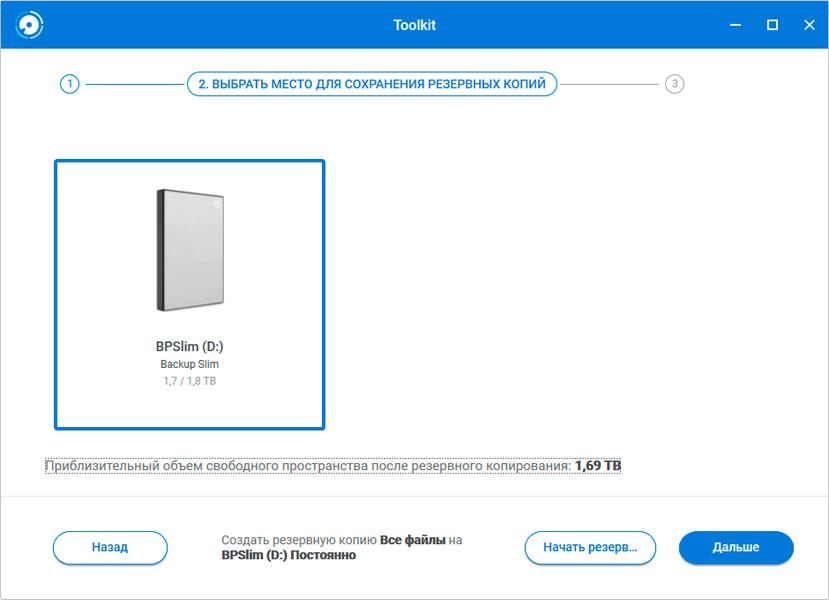 С точки зрения любой системы, внешний винчестер — просто один из накопителей, с которым можно работать так же, как с любым внутренним, и специальные программы для этого не нужны. Однако производители обычно комплектуют свои устройства фирменным ПО — или хотя бы предлагают его скачать. Не является исключением и Seagate: на сайте компании доступна универсальная программа Toolkit. Поскольку она рассчитана на работу со всеми продуктами компании, самым «простым» из них (в том числе Backup Plus Slim) доступна лишь небольшая часть ее возможностей. Желающие могут ознакомиться с подробной документацией, а мы пробежимся по основным функциям вкратце.