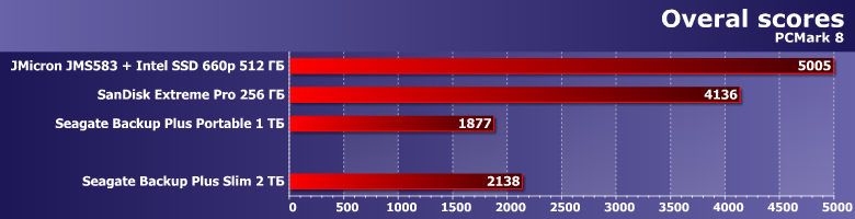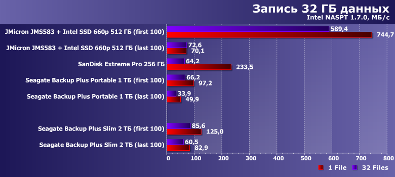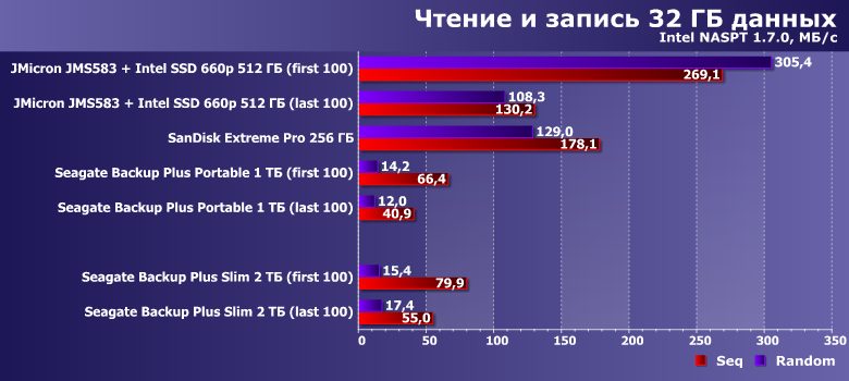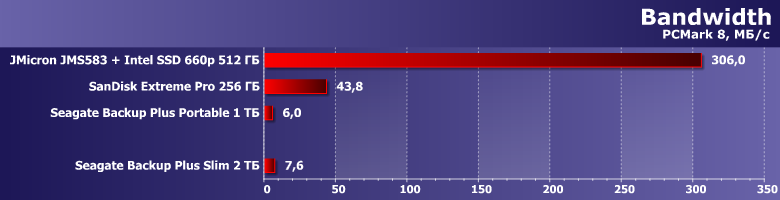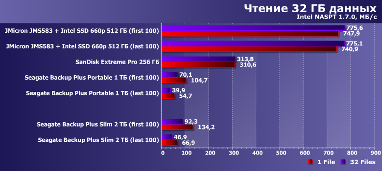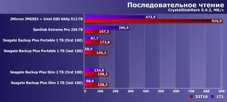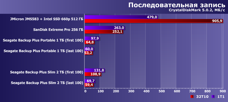 И в качестве ориентира — два накопителя на флэш-памяти. SanDisk Extreme Pro на 256 ГБ — фактически самую быструю портативную флэшку, несмотря на то, что SanDisk не обновляет ее уже более двух лет. И коробочку на базе контроллера JMicron JMS583 с Intel SSD 660p емкостью 512 ГБ на базе QLC-памяти внутри. Отметим, что по цене лишь первая может напрямую конкурировать с Backup Plus Slim — второе решение уже заметно дороже, хотя и его емкость в разы меньше. Это очевидные вещи — как и то, что производительность должна быть в разы выше. Но сравнить ее непосредственно можно — так что стоит этим воспользоваться.