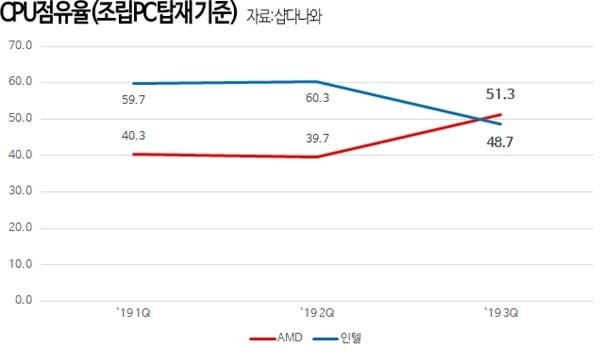 По сообщению источника, в минувшем квартале AMD впервые в истории удалось обойти Intel по продажам процессоров в составе готовых ПК в Южной Корее. Как свидетельствует статистика, 51,3% всех готовых ПК, проданных в течение квартала, были построены на процессорах AMD, а остальные 48,7% — на процессорах Intel.