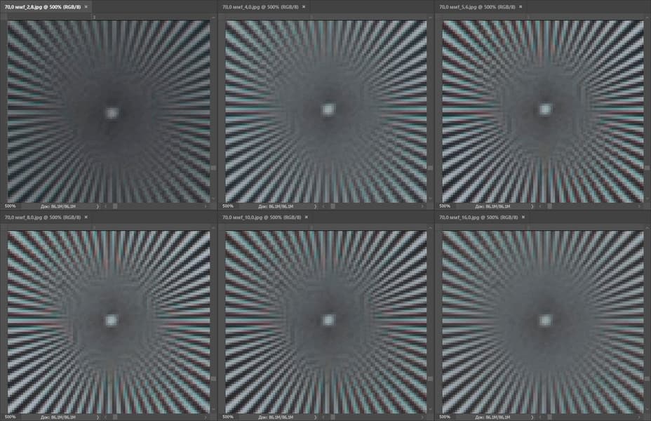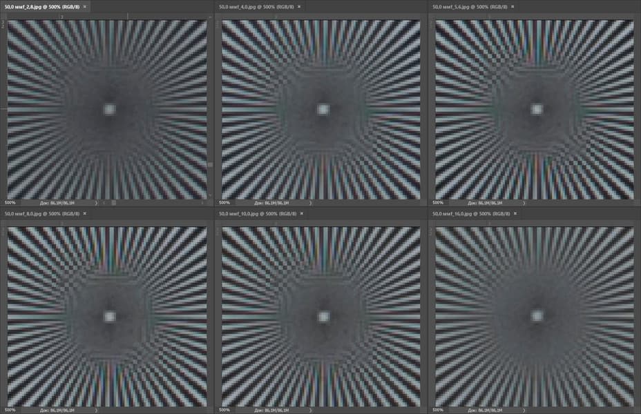 На 50 мм картина та же, лишь с небольшими изменениями. На диафрагме F2,8 центр стал чуть мягче, а край немного прибавил. В целом центр уверенно держится на отметке 0,9 линии на пиксель, а край отстает с тем же разрывом. Также интересно отметить, что эффект дифракции на закрытых диафрагмах стал менее заметным.