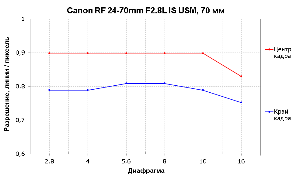 На широком «пейзажном» угле у Canon RF 24-70mm F2.8L IS USM превосходные для зум-объектива показатели разрешения в центре кадра во всем диапазоне диафрагм. Край кадра имеет более скромные значения на диафрагме F2,8, затем отставание сокращается до 0,1 линии на пиксель. Максимальный паритет центра и края кадра достигается при значении относительного отверстия F10.