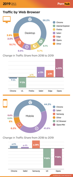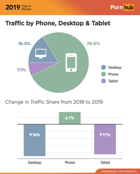 Один из самых популярных порносайтов в мире Pornhub по традиции подвёл итоги 2019 года. В подходящем к концу году для просмотра порно стали ещё чаще использовать мобильные устройства — их доля в трафике Pornhub достигла 83,7%.