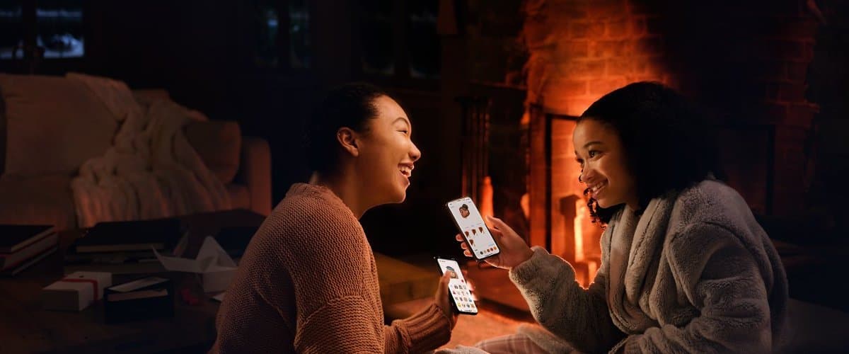 Как можно видеть, смартфон в руке девушки справа на первый взгляд лишён каких бы то ни было вырезов. Но если приблизить, можно увидеть любопытную деталь.