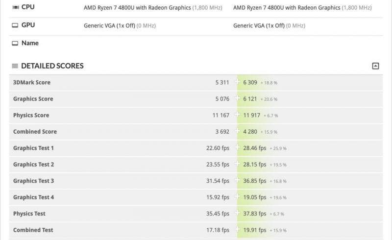 Впрочем, производители ноутбуков смогут поднимать TDP до 25 Вт. В таком случае производительность CPU Ryzen 7 4800U повышается примерно на 7%, а вот прибавка на счету GPU намного весомее — сразу 20%.