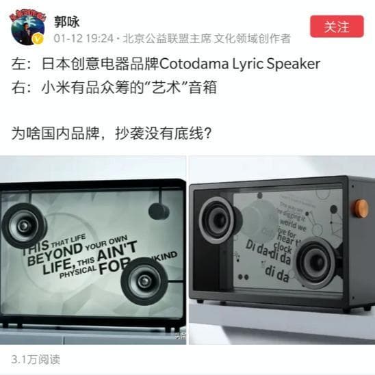 Судя по всему, в своей Mirror Art Floating Speaker компания Xiaomi попросту скопировала конструкцию системы Lyrics Speaker, изготовленной японской технологической компанией Cotodama. Пользователи заметили, что Mirror Art Speaker выглядит как практически полная копия Lyrics Speaker.