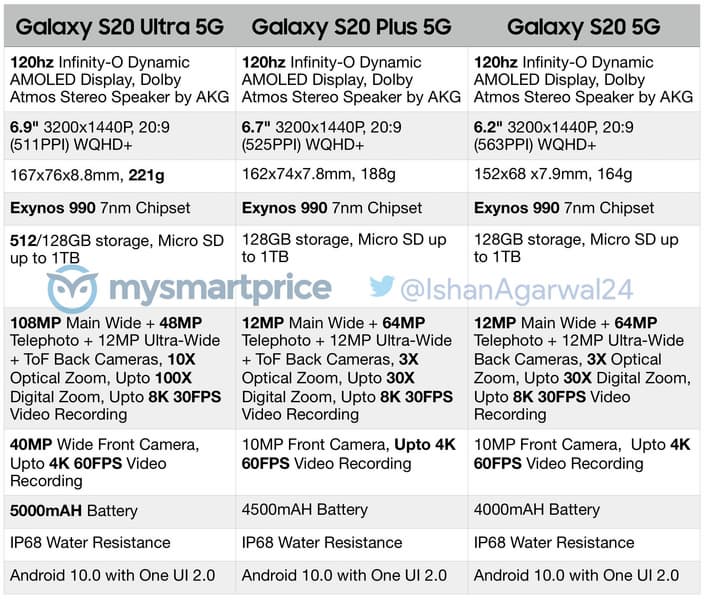 Ресурс, за которым стоит известный инсайдер Ishan Agarwal, опубликовал таблицу официальных (на это указывает, в частности, и шрифт на изображении — изображение явно взято из фирменного источника Samsung) характеристик новых флагманов Samsung — Galaxy S20 5G, Galaxy S20+ 5G and Galaxy S20 Ultra 5G. Теперь можно сказать, что мы о смартфонах знаем все.