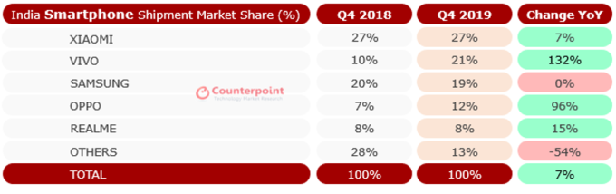 Китайская фирма Vivo обогнала Samsung и стала вторым по величине производителем смартфонов в Индии в 4 квартале 2019 года. Xiaomi с рыночной долей 27% лидирует в стране в течение десятого квартала подряд.