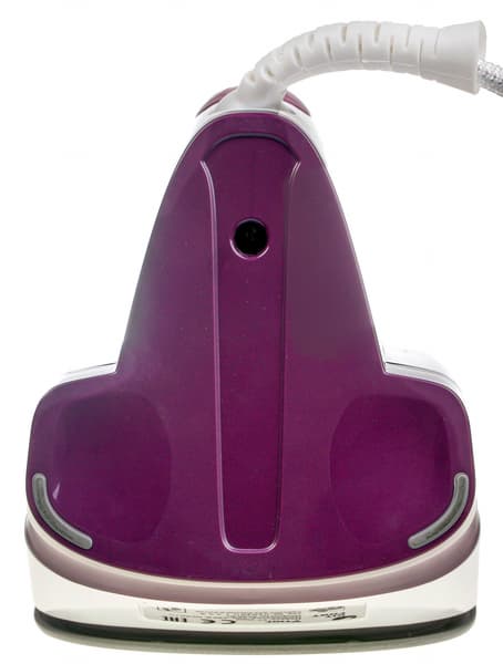 Утюг классического вида и формы оформлен в белом и фиолетовом цветах. Вес прибора средний — не легкий и не тяжелый. Снаружи, в месте контакта с ладонью, ручка оснащена прорезиненной вставкой, что обеспечивает ее более надежный контакт с рукой. Прямо под большим пальцем находятся две кнопки — распыления воды и парового удара. На кнопках нанесены очевидные для понимания пиктограммы. Двигаясь далее к носику утюга, мы видим регулятор мощности подачи пара, отверстие для заливки воды, прикрытое откидной крышкой, и сопло распылителя воды.