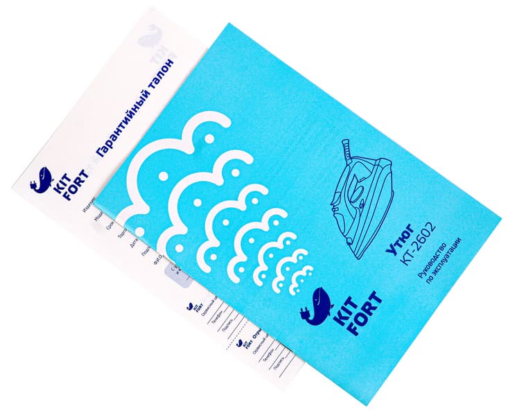 Утюг упакован в картонную коробку небольшого размера. Одноцветная голубая коробка оформлена типовым для Kitfort образом: логотип, слоган, название и модель устройства на фронтальных сторонах, технические характеристики и описание прибора — на боковых. Ручкой для переноски упаковка не оснащена.
