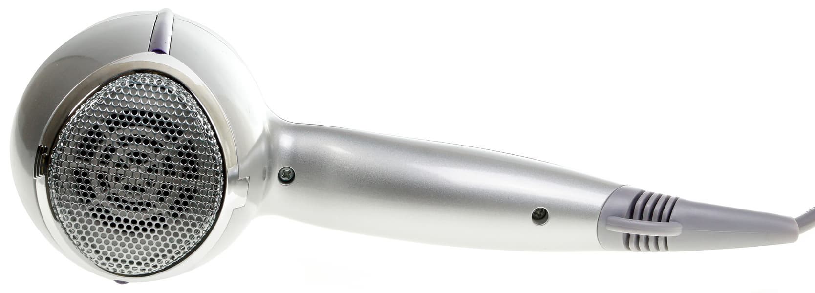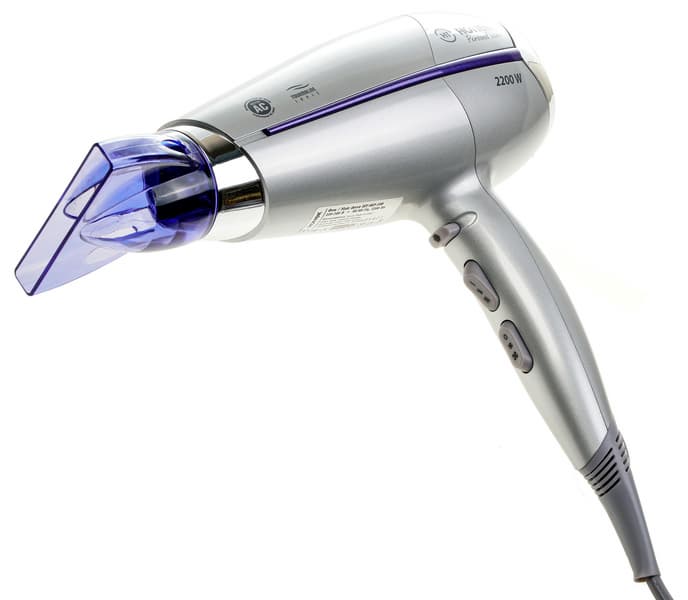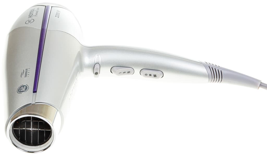 Фен оформлен в светло-сером, похожем на серебристый, цвете; по центру боковой стороны проходит фиолетовая вставка. Материал не имеет Soft Touch или другого прорезиненного покрытия, но пластик не скользит в руках. Диаметр ручки неодинаков по длине. Благодаря этому ручка удобно, как влитая, располагается в ладони. В традиционном месте — с внутренней стороны — находятся переключатели режимов и кнопка подачи холодного воздуха. Шнур электропитания присоединяется в нижней части ручки. Место соединения защищено гибким пластиковым кожухом, в котором находится небольшая петля для подвешивания.