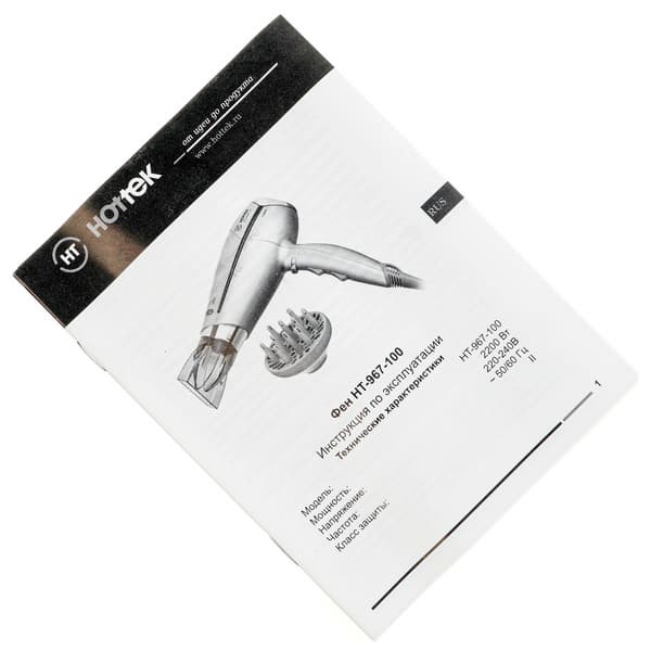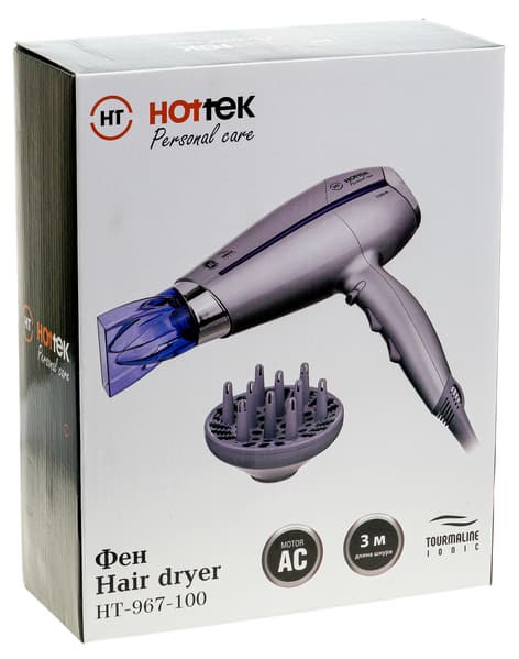 Поскольку мы уже знакомы с другими устройствами этого производителя, можем сказать, что коробка с феном Hottek HT-967-100 оформлена в фирменном стиле Hottek. На светлом фоне фронтальной и задней сторон размещена фотография устройства, его название, модель и наиболее важные характеристики. Боковые грани параллелепипеда, а также верхняя и нижняя стороны выполнены в контрастном темно-сером цвете. На одной из боковых сторон на трех языках (русском, английском и казахском) представлен список достоинств и свойств аппарата. Приспособлением для переноски упаковка не оснащена.