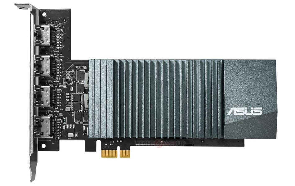 Компания Asus обновила видеокарту на базе GeForce GT 710, выпущенную примерно в 2016 году, изменив печатную плату, чтобы наделить это изделие четырьмя выходами HDMI. Уточним, что видео с разрешением 4К и кадровой частотой 60 к/с можно вывести только на один из них. Если вывести видео 4К более чем на один выход, придется довольствоваться кадровой частотой 30 к/с.