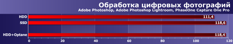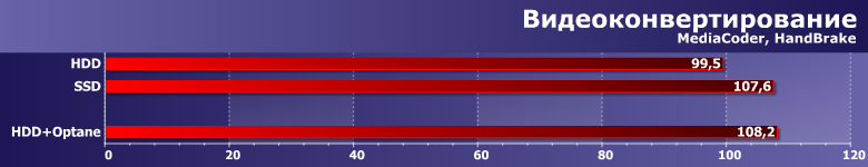 Как мы уже отмечали, хотя транскодирование считается чисто процессорной нагрузкой, даже на ультрабучном Core i3 переход на SSD улучшает результаты почти на 8%. Optane же оказывается еще быстрее. Причем никакого читерства здесь нет — разброс результатов по пяти прогонам менее 1% в каждой программе, т. е. все ускорение за счет того, что «внутренняя жизнь» операционной системы, равно как и работа со служебными областями файловой системы, локализуются где-то в области кэширующего накопителя и винчестеру читать-писать «пользовательские» данные не мешают. SSD бы не ускорился, поскольку ему несколько потоков только в радость — механике нет.