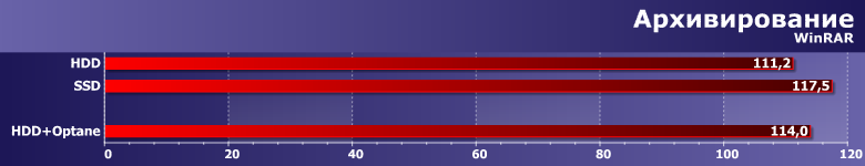 WinRar в таком режиме тоже в основном «нагружает» процессор, но немного зависит и от накопителя. Optane формально компромисс, а фактически первый прогон теста выполняется с «винчестерной» скоростью и только со второго система кэширования начинает пытаться что-то оптимизировать. Впрочем, тут у нее поле для деятельности изначально ограниченное — но уже понятно к чему готовиться в дисковых тестах.