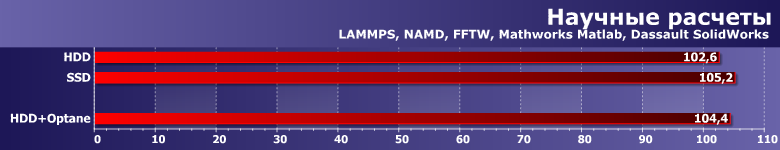 И это же мы наблюдаем и в общем зачете. Таким образом, «тяжелая» неинтерактивная работа как раз тот случай, когда можно говорить о каком-то паритете. И ничего удивительного — тут и разница между механикой и NAND-флэш невелика, так что странным было бы ожидать резкого прорыва кэширующих технологий. Просто механика иногда, но немного мешает и здесь. Optane Memory инкапсулирует системную активность внутри себя — и больше ничего никому не мешает. Понятно, что радикальное решение проблемы лучше — но и дороже. Тем более что оно должно быть действительно радикальным: на твердотельный накопитель должны «помещаться» не только программы, но и рабочие данные. По крайней мере, основная их часть.