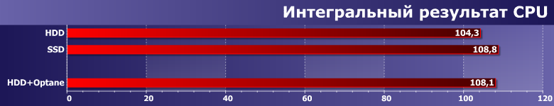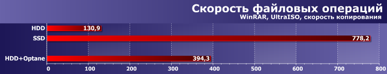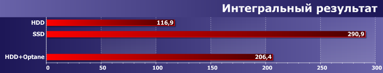 Разница между твердотельным и механическими накопителями невелика, а «оптанизированная» система «встраивается» между ними чуть ближе к первому.