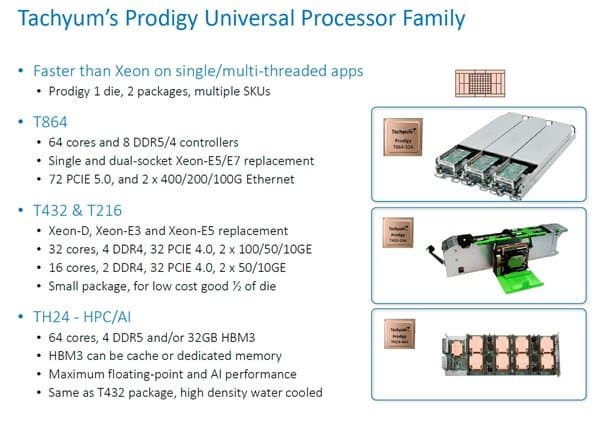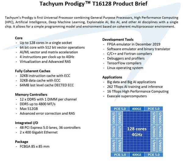 Между тем, Prodigy T16128 выглядит вполне современно: 128 ядер, 64-битная адресация, обработка четырех инструкций за такт, поддержка виртуализации, частота до 4,0 ГГц. Интегрированный 12-канальный контроллер памяти DDR5 поддерживает по одному модулю частотой до 4800 МГц на канал, но за счет большого объема модуля (до 512 ГБ) суммарный поддерживаемый объем ОЗУ достигает 6 ТБ. В перечне периферийных возможностей – контроллер PCIe 5.0 (до 48 линий интерфейса) и два контроллера 400 Gigabit Ethernet.