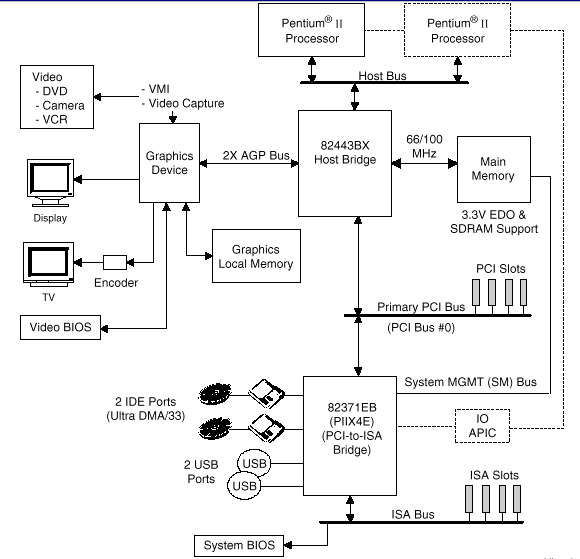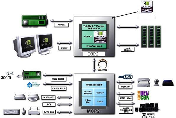 Раз уж это стандарт, изучим его подробнее. Базовая концепция: распределение основных функций по двум микросхемам — процессору и чипсету. Заметим, что название последнего уже некорректно: нынешний «набор микросхем» состоит из одной микросхемы. Впрочем, производители это название и не используют, называя в официальной документации хабом. А в неофициальной — по привычке продолжают.