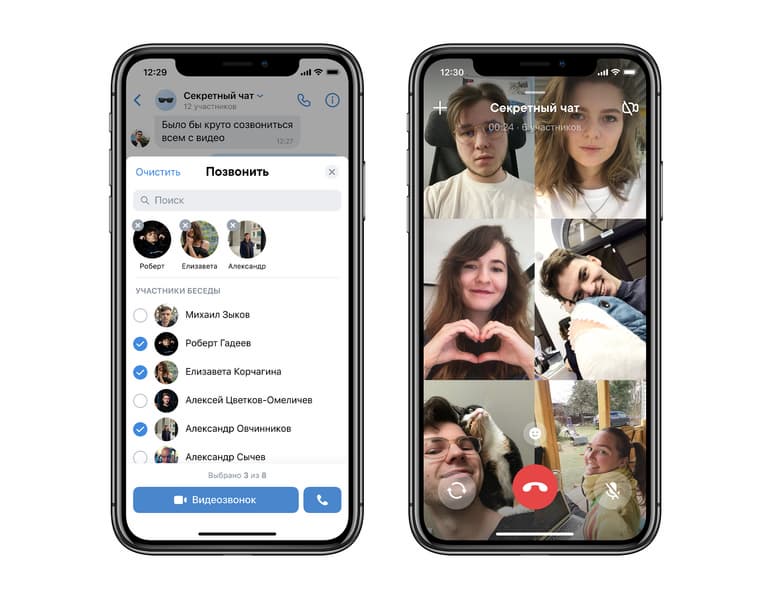 Чтобы начать разговор, нужно открыть подходящую беседу в приложении, нажать на значок трубки и выбрать, кого из чата пригласить в звонок. Добавить собеседника также можно во время видеозвонка.