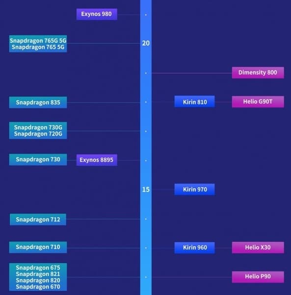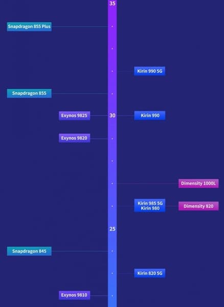 На данный момент с большим отрывом лидирует текущая флагманская платформа Qualcomm — Snapdragon 865. Заметно ниже расположилась Samsung Exynos 990 на втором месте. На третьем расположился прошлогодняя Snapdragon 855 Plus. Huawei Kirin 9905G сумела занять лишь четвёртое место, обогнав Snapdragon 855 на пятом. Интересно, что относительно недорогая MediaTek Dimensity 1000L подобралась довольно близко к своим более дорогим конкурентам.