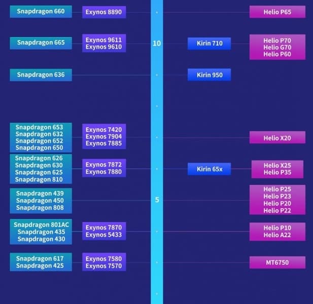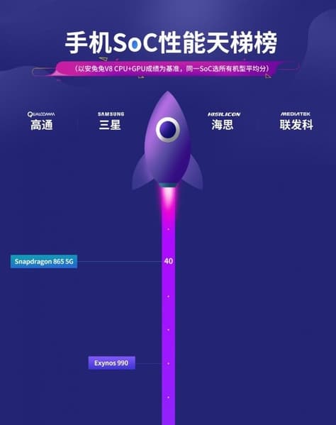 Сравнение учитывает суммарные баллы CPU и GPU, набранные в бенчмарке Antutu V8. В рейтинге участвуют однокристальные системы Qualcomm, Samsung, Huawei HiSilicon и MediaTek. Он отображается в виде шкалы с ракетой на верху и чем ближе к ракете SoC, тем производительнее она. Расстояние между платформами отражает разницу в производительности.