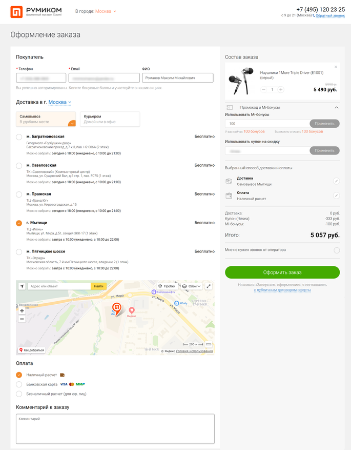 Кладем выбранный товар в корзину — переходим на ее страницу, где и происходит вся процедура заказа. Заполняем небольшую анкету, выбираем точку самовывоза и так далее. Мы предварительно зарегистрировались, за что магазин начислил нам 100 внутренних бонусов. Которые, что немаловажно, можно сразу потратить. Плюс у нас был промокод, с которым цена стала еще более низкой.
