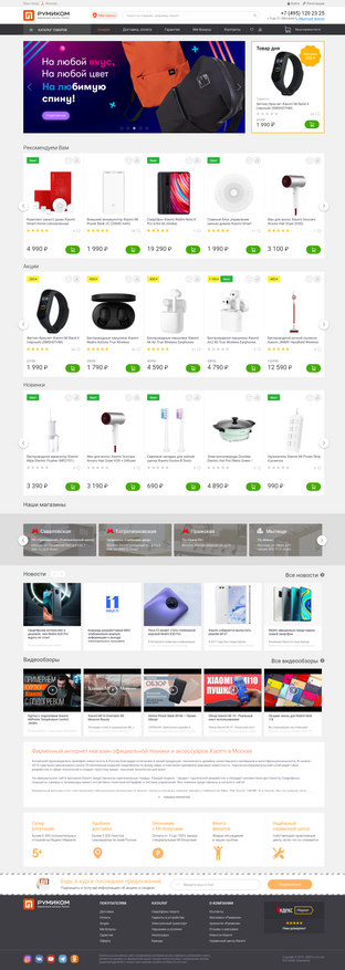 Сайт магазина, расположенный по адресу https://ru-mi.com, сделан по всем современным канонам: центральный динамический баннер, «плитка» из товаров — все на месте. При этом смотрится он замечательно благодаря ярким иллюстрациям, качественной верстке и обилию различного дополнительного контента, о котором мы еще поговорим ниже.