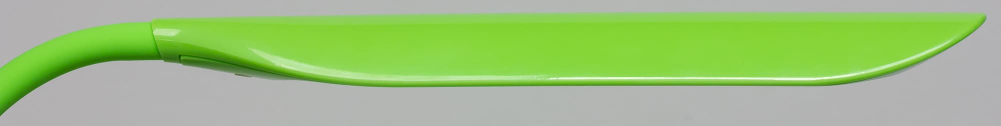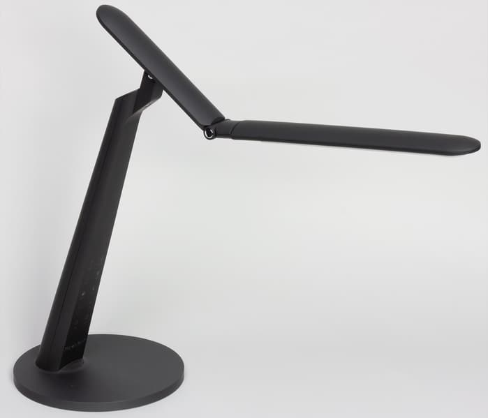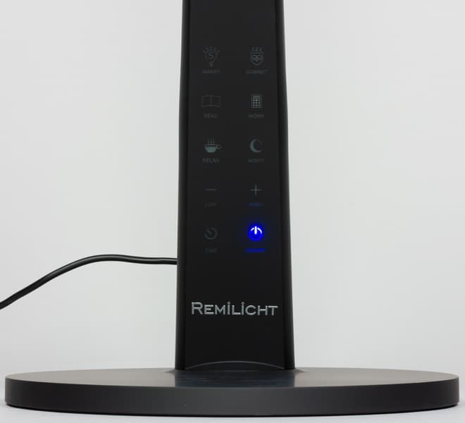 Спереди на грани стойки расположены несколько сенсорных кнопок. Значки на кнопках подсвечиваются зеленым, кроме кнопки питания — ее значок подсвечивается синим. Когда лампа подключена к сети, но выключена, значок питания светится, что позволяет без проблем включить лампу в полной темноте. Далее зеленым подсвечиваются только значки активных в данный момент функций или значки «+» или «−», когда достигнуты пределы по регулировки яркости. Тут есть небольшой эргономический просчет, так как в неподсвеченном состоянии значки бледноваты и кнопки сложно распознать, особенно в полутьме.