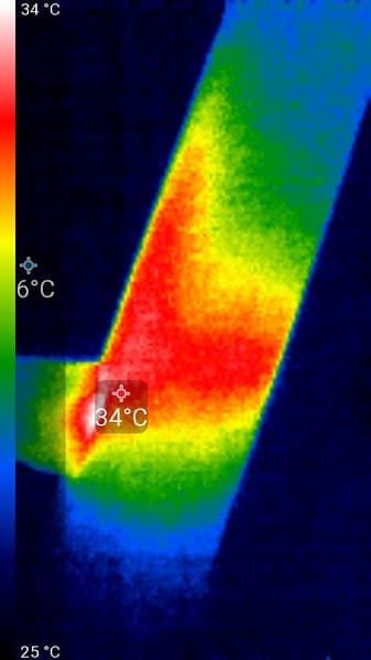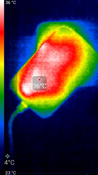После продолжительной работы лампы Remilicht LA-H688 на максимальной яркости и с подключенной нагрузкой к USB-порту (см. ниже) нагрев лампы умеренный (температура в помещении примерно 23 градуса). Максимум температуры — на осветительном блоке (снимок сверху):
